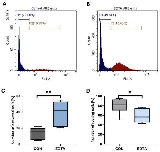 Flow cytometry of the neutrophil respiratory burst. (A) Flow cytometry spectrum of neutrophils in the control group. (B) Flow cytometry spectrum of neutrophils in the EDTA group. (C) The percentage of activated cells in the control and EDTA groups. (D) The percentage of stationary cells in the control and EDTA groups. CON: control group, EDTA: experimental group. Statistically significant differences are indicated by * p < 0.05, ** p < 0.01.