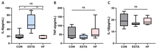 Levels of IL-6, TNF-α and IL-1β in the serum of each group detected by ELISA. (A) Level of IL-6 in the serum of each group. (B) Level of TNF-α in the serum of each group. (C) Level of IL-1β in the serum of each group. CON: control group, EDTA: experimental group, HF: recovery group. Statistically significant differences are indicated by * p < 0.05, ** p < 0.01.