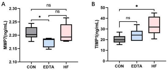 Levels of MMP7 and TIMP1 in the serum of each group detected by ELISA. (A) Level of MMP7 in the serum of each group. (B) Level of TIMP1 in the serum of each group. CON: control group, EDTA: experimental group, HF: recovery group. Statistically significant differences are indicated by * p < 0.05.