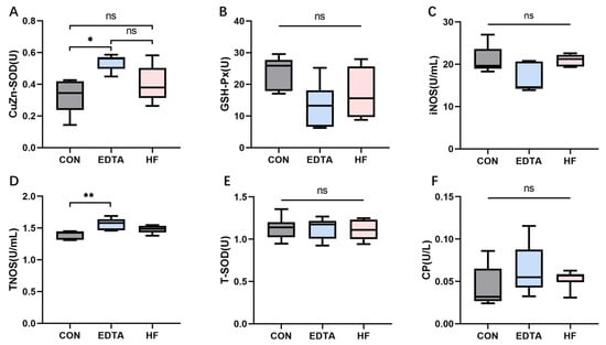 The activity of (A) CuZn-SOD, (B) GH-PX, (C) iNOS, (D) TNOS, (E) T-SOD and (F) CP in the serum of each group detected by colorimetric and hydroxylamine test methods. CON: control group, EDTA: experimental group, HF: recovery group. Statistically significant differences are indicated by * p < 0.05, ** p < 0.01.
