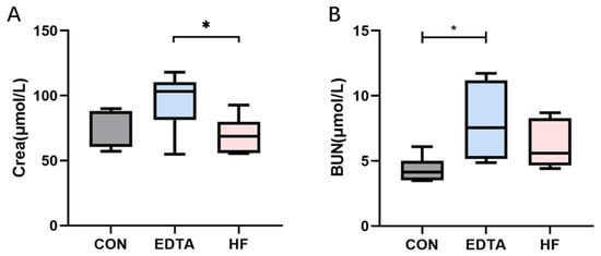 Levels of Crea and BUN in the serum of each group detected by automatic biochemical analyzer. (A) Level of Crea in the serum of each group. (B) Level of BUN in the serum of each group. CON: control group, EDTA: experimental group, HF: recovery group. Statistically significant differences are indicated by * p < 0.05.