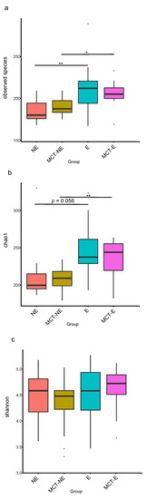 Fecal alpha diversity indices: (a) Observed Species; (b) Chao1; (c) Shannon, measured in epileptic (E) and non-epileptic (NE) dogs before (D0) and after the MCT diet (D30). Asterisks indicate significance between groups (* p < 0.05; ** p < 0.01).