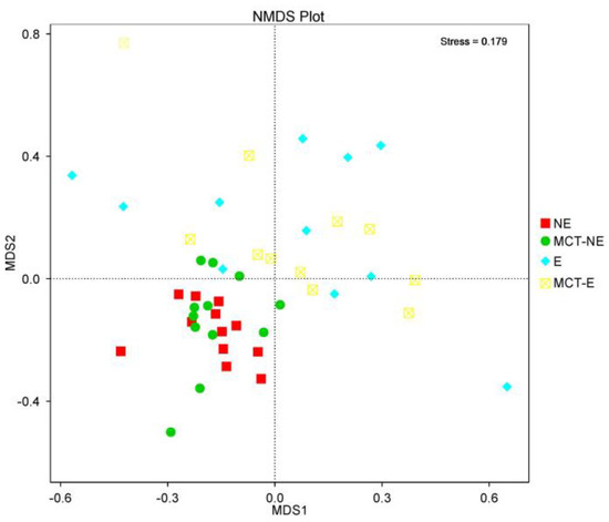 Non-metric multidimensional scaling (NMDS) plots showed that epileptic (E) and non-epileptic (NE) dogs were two distinct clusters before and after the MCT diet.