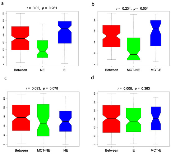 Analysis of similarity (Anosim) between epileptic (E) and non-epileptic (NE) dogs in baseline conditions ((a): E vs. NE) (Anosim r = 0.002; p = 0.261), between E and NE dogs after the MCT diet ((b): MCT-E vs. MCT-NE) (Anosim r = 0.234; p = 0.004), in NE dogs before and after the MCT diet ((c): NE vs. MCT-NE) (Anosim r = 0.093; p = 0.078) and E dogs before and after the MCT diet ((d): E vs. MCT-E) (Anosim r = 0.008; p = 0.363).