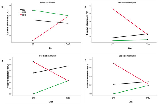 Means of (a) Firmicutes, (b) Proteobacteria, (c) Fusobacteria, and (d) Bacteroidetes at phylum level for non-epileptic (NE), drug-sensitive epilepsy (DSE) and drug-refractory epilepsy (DRE) groups, before (D0) and after one month on the MCT diet (D30).