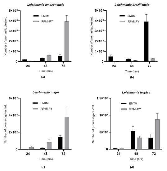 Growth curves of Leishmania spp. in RPMI-PY and EMTM media with 4 × 106/mL inoculation in 25 cm2 flasks at 26 °C observed over a 3 days period under a light microscope: (a) Leishmania amazonensis; (b) Leishmania braziliensis; (c) Leishmania major; (d) Leishmania tropica. Bars show the mean ± SD. The significant difference in parasite growth rate for different media was determined using two-way analysis of variance (ANOVA) analysis and demonstrated as all values showing a p < 0.05.