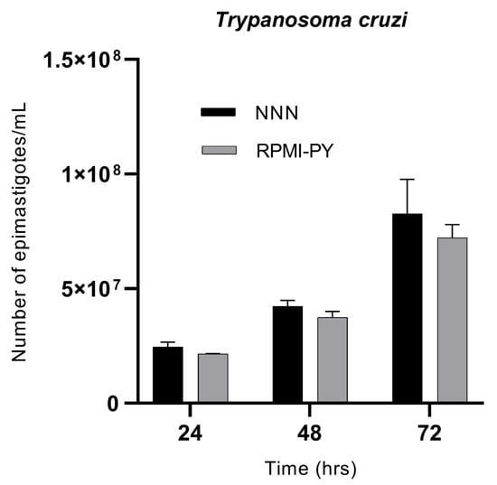 Growth kinetics of Trypanosoma cruzi parasites/mL in NNN and RPMI-PY media at 24 h, 48 h, and 72 h. Values represent the mean of triplicates. Error bars indicate standard deviations. The significant difference in parasite growth rate for different media was determined via two-way analysis of variance (ANOVA) analysis and demonstrated as all values showing a p < 0.05.