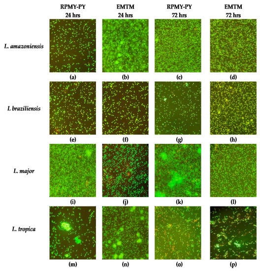 To gather the biological information more comprehensively, we also recorded the dominant morphology of the parasites in RPMI-PY at specific times (Figure 3). In Leishmania, acridine orange and ethidium bromide (OA/BE) staining was primarily used to distinguish between live and damaged or dead cells [39]. On the first day of culture, after labeling with OA/BE, the cells showed green fluorescence and classical morphology being slender, flagellated, and elongated in both RPMI-PY and EMTM medium. Within 24 h in the cultures of L. amazonensis and L. braziliensis, more cells were observed in EMTM than in RPMI-PY, whereas more cells were observed in RPMI-PY in the cultures of L. tropica and L. major. In addition, fluorescence microscopy with OA/BE double staining revealed that cell death was observed in the L. major group in EMTM compared with the RPMI-PY culture. In contrast, in the RPMI-PY cultures of L. braziliensis, cells with greater chromosome condensation were observed than in EMTM cultures [39,40,41]. At 72 h, however, there was an increase in the number of green, viable promastigotes in all Leishmania strains in RPMI-PY compared with EMTM, with the exception of L. braziliensis [27,28,29,30,31,32]. RPMI-PY determined viable and uniform cells in cultures of L. major, L. amazonensis, and L. tropica. Almost all promastigotes had long, thin, and progressively tapered bodies, with flagella one and a half to two times as long as the body, while L. braziliensis in the RMPI-PY medium had consistently smaller bodies. In L. tropica, the cytoplasmic membrane appeared somehow broken, and the nucleus appeared red in both media at 72 h.