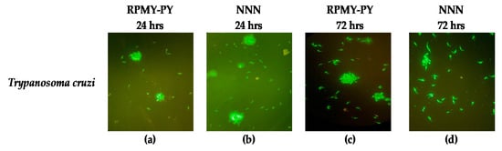The protozoa parasites were stained with a mixture of ethidium bromide (100 mg/mL) and acridine orange (100 mg/mL) [37,38]. Promastigotes/epimastigotes (4 × 106/mL) were suspended in 25 cm2 flasks containing 10 mL of RPMI-PY and in 25 cm2 containing conventional media. After 24, 48, and 72 h, the cells (1 × 106) were centrifuged, and the pellet was resuspended in 25 mL of the stained mixture and examined with a 40× objective using a Leica DM 4000B fluorescence microscope (Leica, Heerbrugg, Switzerland) to analyze the morphological changes that the parasites assumed in the culture media [37,38].
