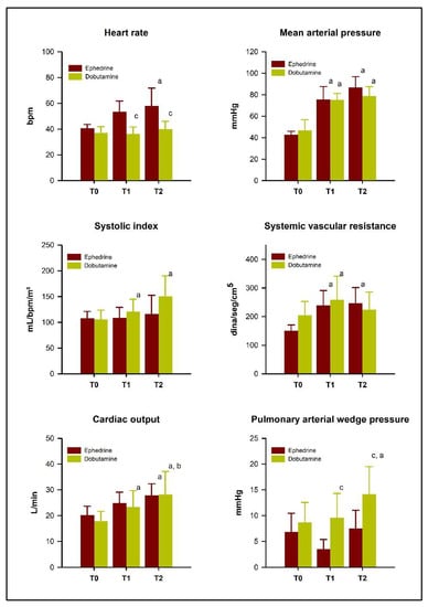 Changes in heart rate, mean arterial pressure, systolic index, systemic vascular resistance, cardiac output, and pulmonary arterial wedge pressure in 13 isoflurane-anesthetized horses treated with dobutamine or ephedrine, measured at the time of the detection of hypotension (T0), upon reaching a mean arterial pressure of 70 mmHg (T1), and 15 min after T1 (T2). Superscript letters indicate a significant difference (p < 0.05) from the basal moment (a), from goal moment (b), or from the other group in the same moment (c).