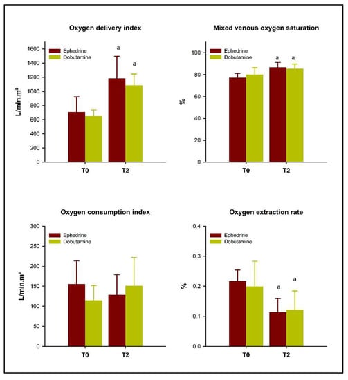 Changes in oxygen delivery index, mixed venous oxygen saturation, oxygen consumption index, and oxygen extraction rate in 12 isoflurane-anesthetized horses treated with dobutamine or ephedrine, at the time of the detection of hypotension (T0), and 15 min after reaching a mean arterial pressure of 70 mmHg (T2). Superscript letters indicate a significant difference (p < 0.05) from the basal moment (a).