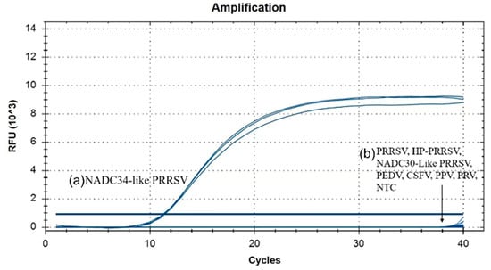 Specificity of NADC34-like PRRSV gene based on the qRT-PCR assay. (a) Represented the real-time RT-PCR amplification curve of NADC34-like PRRSV plasmid; (b) Represented the real-time RT-PCR amplification results of PRRSV, PRRSV, HP-PRRSV, NADC30-like PRRSV, PEDV, CSFV, PPV, PRV, and no-template control (NTC).