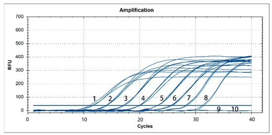 Sensitivity analysis of the TaqMan real-time RT-PCR for NADC34-like PRRSV. RFU: relative fluorescence units; 1–9: 7.80 × 108 copies/μL–7.80 × 100 copies/μL; 10: negative control(ddH2O). The lowest copy number detected by RT-qPCR was 7.80 × 101 copies/μL.