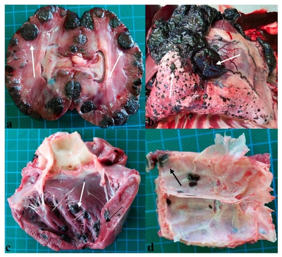 Primary melanoma in a dog. (a) Metastasis in kidneys (white arrows). (b) Pleural and lung metastasis (white arrows). (c) Cardiac metastasis (white arrows). (d) Metastasis in the parietal bone (black arrow).