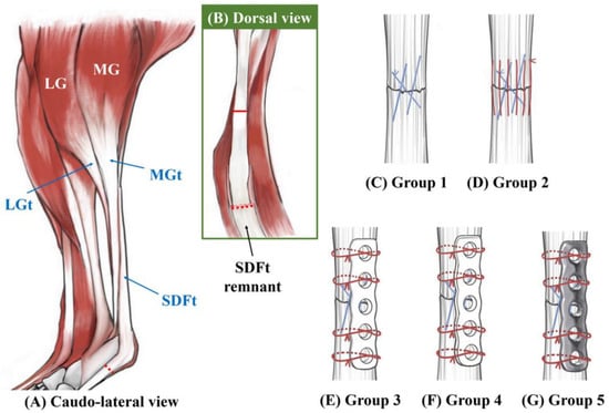 - Duffy, D.J.; Curcillo, C.P.; Chang, Y.-J.; Gaffney, L.; Fisher, M.B.; Moore, G.E. Biomechanical evaluation of an autologous flexor digitorum lateralis graft to augment the surgical repair of gastrocnemius tendon laceration in a canine ex vivo model. Vet. Surg. 2020, 49, 1545–1554. [Google Scholar] [CrossRef]