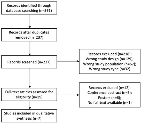 A total of 561 articles were identified through the database search, and one article was retrieved through cross-reference. After removing duplicates, 237 articles were initially screened by title and abstract. At this step, 218 articles were excluded based on the study design (n = 129), study population (n = 57), and study type (n = 32). A total of 19 articles underwent full-text review. Then, 12 articles were removed as they were conference abstracts or posters, with no availability of full text (n = 12).