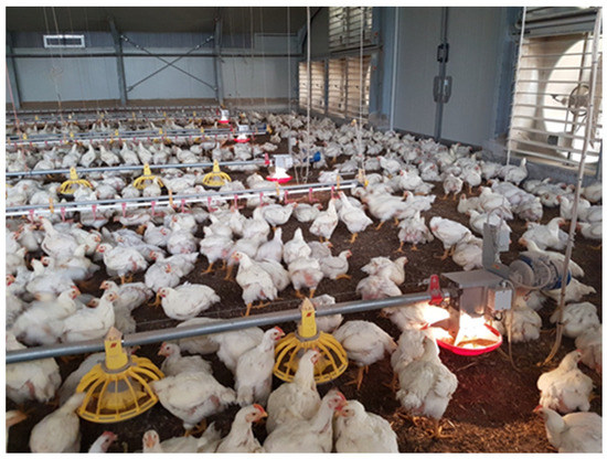 The trial was carried out in two poultry houses (CONTROL and F-LED) with a floor area of 2150 m2 (length 119.45 × 18 m), located on a farm working in meat chicken production in the Marche Region, Italy. From a construction point of view, both buildings had the same equipment. The walls and the roof were made with 50 mm panels sandwiching internal polyurethane. The ventilation technology consisted of air-forced fans with a capacity of 45,000 m3/h, installed at the ends of the walls. Tunnel type, with darkened windows with automatic opening, for the heating air generators, with three burners and ten radiant hoods, was adopted. Cooling panels were also installed. Water and feed were administered ad libitum by five lines of nipples each and four lines of feeders (7 cm/bird).