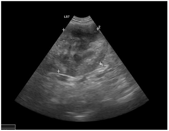 An 8-year-old neutered male Rhodesian Ridgeback (weight 41.5 kg) with fever and severe thrombocytopenia had been treated with an immunosuppressive dosage of prednisolone and doxycycline for nine days due to a suspicion of immune-mediated thrombocytopenia (testing for platelet-bound antibodies was negative). Primary immune-mediated thrombocytopenia was suspected because no underlying diseases or triggering factors (e.g., neoplasia or vector-borne infections such as Anaplasma phagocytophilum or Babesia canis) were obvious at the initial evaluation. Treatment with doxycycline was started to treat possible vector-borne infections (e.g., with Anaplasma phagocytophilum) while the PCR result was pending. Because the dog had not traveled outside Germany, an Ehrlichia canis or Leishmania spp. infection was very unlikely. PCR testing for Bartonella spp. was not performed. The dog received regular ecto- and endoparasite prophylaxis, and was regularly vaccinated against canine distemper, infectious canine hepatitis, parvovirus infection, leptospirosis, and rabies. The reasons for presentation and reevaluation at the internal medicine unit of the University of Berlin were recurrence of fever, lethargy, inappetence, and lack of improvement of the thrombocytopenia. Clinical examination revealed a rectal temperature of 40.2 °C. The dog had pale pink, moderately moist mucous membranes, and a capillary refill time of 1 s. The pulse rate was 100 beats/min. The pulse was symmetrically strong and regular. The auscultation of the heart revealed regular heart sounds. A left apical pansystolic grade 3/6 murmur was auscultated. The arterial systolic blood pressure was measured at the tail using the Doppler technique (Doppler Eickemeyer, Tuttlingen, Germany). It was 120 mmHg in the quiet dog. Abdominal palpation appeared painful. On the margin of the right pinna, a small wound covered with a crust was detected. Hematological findings (Sysmex XT-2000i, Norderstedt, Germany) included severe thrombocytopenia (confirmed by manual counting), severe neutrophilia with a left shift, and monocytosis. Activated thromboplastin time (PTT) was prolonged, and prothrombin time (PT) was at the upper range of normal (Schnitger and Gross, Amelung, Lemgo, Germany). Blood chemistry (Konelab Prime 60i, Thermo Scientific, Berlin, Germany) revealed moderate azotemia; hyperphosphatemia; hyperbilirubinemia; hyperglobulinemia (55 g/L); and increased serum lipase, CRP, and cardiac troponin I concentrations (Table 1). At admission, a blood sample was taken for a blood culture (Oxoid Signal®, Thermo Fisher Scientific GmbH, Karlsruhe, Germany). The chest radiograph (DigitalDiagnost, Philips, Hamburg, Germany) was unremarkable. The abdominal radiograph revealed splenomegaly and a mild loss of detail in the retroperitoneal space. Ultrasonography of the abdomen (Logic S7, Scil animal care GmbH, Viernheim, Germany) revealed a heterogeneous complex mass (5 × 5 cm) at the cranial pole of the right kidney with a small amount of free fluid in the retroperitoneal space (Figure 1), a 0.4 × 0.4 cm hypoechoic lesion in the spleen without blood flow, and a painful and swollen pancreas. An abscess, abscessing neoplasm, or an infarct of the right kidney; a splenic infarct; and pancreatitis were suspected.