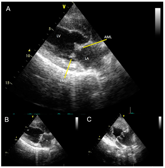 The patient’s echocardiographic examination (Vivid 7 Dimension, Scil animal care company GmbH, Viernheim, Germany) showed mitral valve vegetation, visible as hyperechoic overlays of the unevenly thickened mitral valve (Figure 2A). The mitral valve changes were evident in diastole and in systole in the left ventricle as well as in the left atrium (Figure 2B,C). The tricuspid valve presented as mildly thickened with no discernible plaques. Both semilunar valves were unremarkable on the echocardiogram. In M-mode, all wall thicknesses and the size of the left and right ventricles as well as the right atrium were within the biological variance. The left atrium was mildly dilated. Contractility was not impaired, and the myocardium was unremarkable. Doppler sonography and color Doppler showed a severe regurgitation jet over the massively altered mitral valve. With a velocity of up to 5.6 m/s, the regurgitation jet extended to the roof of the left atrium, which it almost completely filled. The tricuspidal regurgitation jet was visible close to the leaflets’ commissure. The aortic (1.4 m/s) and pulmonary (1.15 m/s) maximal blood flow velocities, respectively, were normal. With registration over five minutes, the electrocardiogram (PC-EKG 2000, Eickemeyer, Tuttlingen, Germany) showed a sinus rhythm with a heart rate at the upper reference limit (150 beats/min) and only one left ventricular premature beat with a right bundle branch block morphology. There was an S-T segment depression in leads I and II of 0.2 to 0.3 mV.