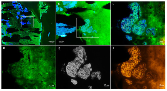 Fluorescence in situ hybridization (FISH) to visualize and identify the bacteria within the patient’s heart valve. (A) Overview of the heart valve showing extensive bacterial biofilms by DAPI staining in blue with the autofluorescent tissue background in green. (B) Magnification of a colonized region of the heart valve (marked in (A)) with a superimposition of the DAPI staining in blue and the Streptococcus genus-specific FISH probes in green (autofluorescent tissue background in green as well). (C) Further magnification of the colonized region (marked in (B)). (D–F) Identical field of view as (C), showing separate fluorescence filter sets for (D) Streptococcus genus-specific FISH probes in green, (E) DAPI DNA staining in black and white, and (F) bacteria with the pan-bacterial FISH probe EUB338 in orange. Nonsense probe not shown. Note the high signal intensity of the streptococci indicating a high ribosomal content, indicative of activity despite correct antibiotic therapy.