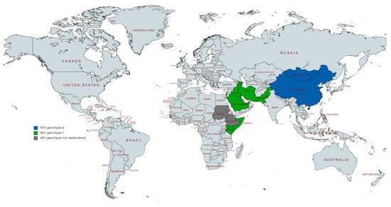 In a study performed in Ethiopia on fecal samples from camels kept under farmers’ management conditions, HEV RNA was detected in 2.2% (1/45) of samples, but the molecular characterization was not performed [46].