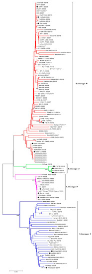 - Yu, F.; Yan, Y.; Shi, M.; Liu, H.Z.; Zhang, H.L.; Yang, Y.B.; Huang, X.Y.; Gauger, P.C.; Zhang, J.; Zhang, Y.H.; et al. Phylogenetics, Genomic Recombination, and NSP2 Polymorphic Patterns of Porcine Reproductive and Respiratory Syndrome Virus in China and the United States in 2014–2018. J. Virol. 2020, 94, e01813-19. [Google Scholar] [CrossRef] [PubMed]