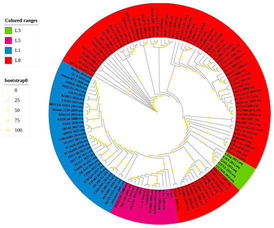 Based on the global PRRSV classification system and NSP2 sequence information in the GenBank database, we selected the NSP2 sequences of 122 PRRSV-2 strains for phylogenetic analysis (Table 1). The phylogenetic tree constructed using these sequences revealed that the PRRSV-2 strains prevalent in China could be classified into four lineages, namely, lineages 1, 3, 5, and 8 (Figure 1 and Figure 2). Among these, lineage 3 is represented by GM2-2011, QYYZ-2011, and FJFS-2012, which appear to be closely related, whereas lineage 1 and lineage 8 strains appear to be separated by comparatively large genetic distances. Since the advent of PRRSV in China, lineage 8, which includes the classical PRRSV strains (CH-1a-like) prevalent before 2006 and the HP-PRRSV-like strains circulating after 2006, has predominated. However, since 2013, lineage 1 strains, also referred to as NADC30-like strains, have spread rapidly across the country, with clinical detection rates comparable to those of HP-PRRSV-like lineage 8 strains.