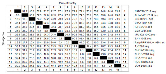 For the purpose of determining similarities among the NSP2 nucleotide sequences of different PRRSV lineages, we analyzed the reference strains information shown in Table 1 based on the Clustal W method in the MegAlign function of DNAStar software.