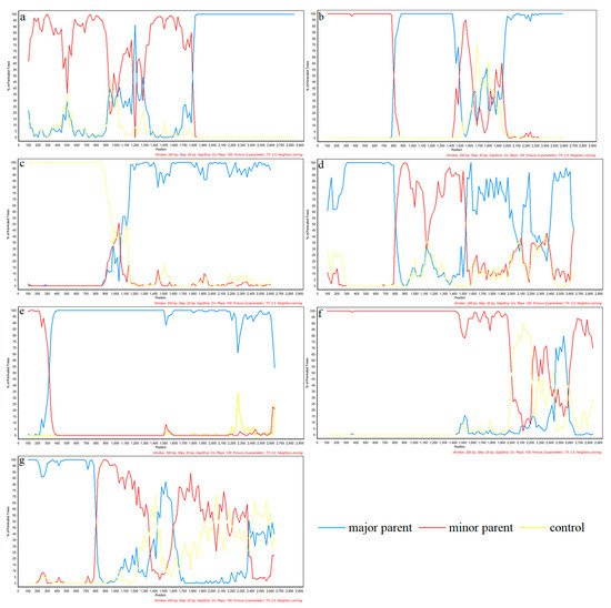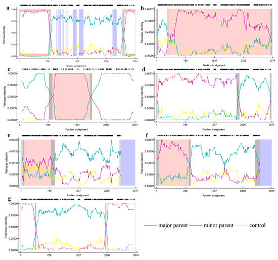 RDP (version 4.0) verification of NSP2 gene recombination events. The horizontal axis represents position in alignment, the vertical axis represents pairwise identity. (a) is the RDP analysis result of the recombinant strain CH-1R; (b) is the RDP analysis result of the recombinant strain SD-YL1712-2017; (c) is the RDP analysis result of the recombinant strain MN-184A-2001; (d) is the RDP analysis result of the recombinant strain NADC30-2017; (e) is the RDP analysis result of the recombinant strain SCya18-2018; (f) is the RDP analysis result of the recombinant strain Ingelvac-ATP-1999; (g) is the RDP analysis results of the recombinant strain SCcd2020-2020.