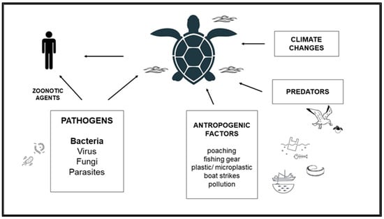 Several pathogens may affect sea turtles causing pathologies that may be lethal in some cases. In fact, pathogens can directly cause fatal diseases or weaken turtles, which more easily may be victims of predators or injuries. Furthermore, pathogens may cause the death of embryos and hatching turtles. Among pathogens, bacteria often represent a severe threat not only for marine turtles’ health, but also for humans that come into contact with them, their products, and the environments where they live [4,154]. Sand contaminated by bacteria excreted with feces, eggs, and oviductal exudate represents a source of infection for people, mainly ecotourists, during their activity on the beach. Personnel working in rescue centers and sea turtle farms may be at risk of infection, as well.