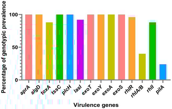 The percentage of each virulence gene found within the P. aeruginosa isolates derived from dogs at the INNO Veterinary Laboratory, Braga, Portugal, between November 2021 and December 2021.
