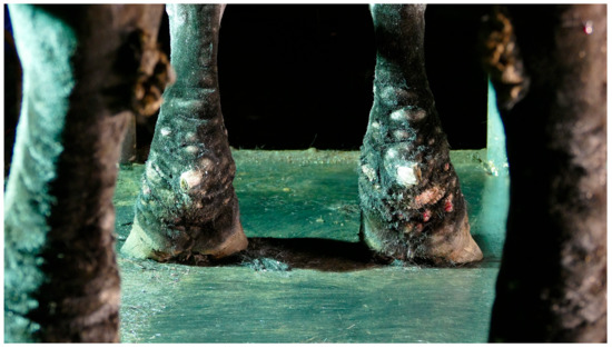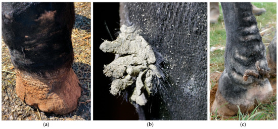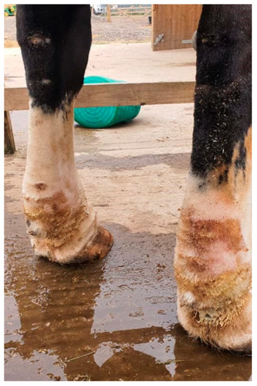 Bacterial infections of the superficial skin (superficial pyoderma) occur frequently in horses affected by CPL, as the skin is more sensitive to trauma, causing easy development of skin lesions. Moreover, the feathering on the legs facilitates moisture retention. In addition, lymphatic dysfunction results in a lowered skin immunity, facilitating bacterial invasion and infection or pastern dermatitis [5,57]. In horses with CPL, the opportunistic pathogen Staphylococcus aureus is the most prevalent bacterial species isolated from skin samples [5,58], as in warmblood horses with pastern dermatitis [59]. Affected skin is irritated, red, inflamed, and/or swollen, and will develop a discharge that appears ‘greasy’ or sticky (Figure 10). The fungal infections most commonly reported in horses are dermatophytoses and onychomycoses [60].