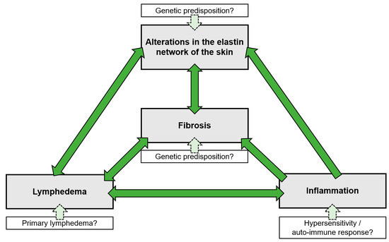 Despite numerous attempts to unravel the etiology and genetic origin of CPL, the causative factor and subsequent pathogenesis of this disease remain unknown. Two diverging hypotheses have been proposed, and although the causative factors in these hypotheses are rather divergent, several mutual elements can be identified. Dysfunction of the lymphatic system, fibrosis, inflammation, and an aberrant elastin network are the four factors that appear to be associated with CPL, and provide the basis for established hypotheses on the pathogenesis. However, the chronology of events within the pathogenesis of CPL proves to be the most debatable factor. For example, lymphedema may drive inflammation and fibrosis, but on the contrary, chronic inflammation and subsequent fibrosis may also adversely affect the functionality of the lymphatic system [21]. As such, a vicious circle can be created whereby these factors might permanently reinforce each other (Figure 2). This is probably the main reason why no initiating or triggering factor for this condition has been identified to date. Consequently, several diverging hypotheses have been formulated regarding the cause of this disorder. However, it is possible that current hypotheses do not stand alone, and each may explain part of the pathogenesis. In addition, a genetic predisposition is assumed to play an important role in the development of CPL, although no specific associated genes have been identified to date. It is also unclear in which factor within this vicious circle a genetic predisposition could be found. For example, alterations in the elastin network could result from an innate lack of elastin quantity or from a genetic predisposition for progressive elastin breakdown. Inflammation could possibly be the result of chronic hypersensitivity or an autoimmune response. In addition, draft horses may be predisposed to develop an excessive accumulation of fibrous connective tissue. Moreover, genetic defects could lead to primary lymphedema. Further research is required to establish both the chronology and the possible genetic origin of the factors leading to the clinical onset of CPL.