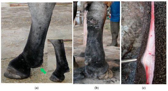 - Twitchell, E.L.; Hartman, R.A.; Waxman, S.J.; Lescun, T.B.; Miller, M.A. Pathology in practice. Coronary band dystrophy with proliferative pododermatitis. J. Am. Vet. Med. Assoc. 2014, 245, 385–387. [Google Scholar] [CrossRef]