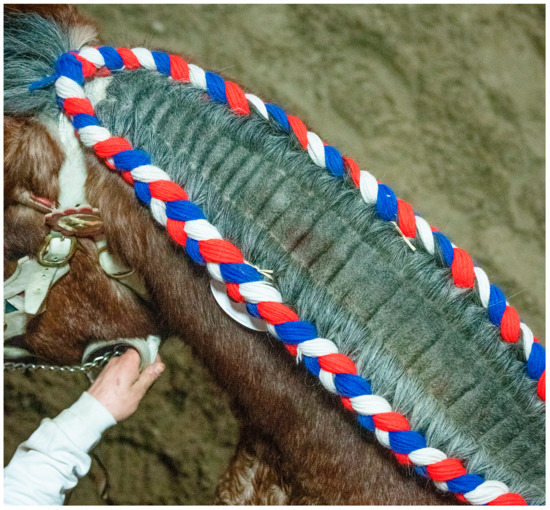 Skinfolds in the neck of a Belgian draft horse. A 6-year-old Belgian draft horse stallion exhibiting folding of the skin in the neck region. The mane has been partially clipped to facilitate easier braiding during studbook inspections (Courtesy of T. van der Weerden, 2021).