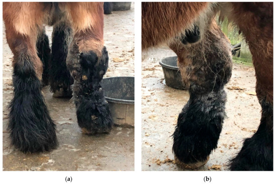Edema is mainly characteristic of the early stage of CPL and gradually progresses to dermal fibrosis [5,8]. Therefore, edema is often only observed in young animals. It is presented by thickened skin in the pastern and fetlock region, also referred to as “pitting edema” (Figure 3). The edema usually passes unnoticed since it is masked by the heavy feathering in draft horses.
