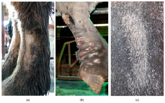 In addition to bacterial infections, parasitic infestations are a significant secondary complication in horses with CPL. A common parasitic infestation that is found in affected horses is mange, caused by Chorioptes bovis [5,29]. These mites may present an aggravating factor or a concurrent complicating factor. Draft horses may be more susceptible to chorioptic mange due to the presence of heavy feathering that traps skin scales and epidermal debris, providing a rich and necessary food supply for mites, while also protecting them against extreme temperatures. Chorioptic mange causes pruritus, lichenification of the skin, alopecia, scaling, and crusting of the distal limbs (Figure 12). As a result of the mite infestation, the horse may become restless and frequently stamp its legs, eventually leading to auto-mutilation. A second parasitic infestation that is often prevalent in severely affected draft horses, especially during the summer, is a maggot infestation. Flies (e.g., Lucilia sericata) are attracted to the warm and moist environment between prominent skinfolds, where fly larvae develop and feed on dead tissue and wound debris.