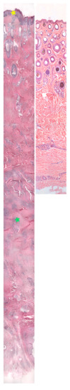 Histology of the skin from the pastern region of a CPL-affected Belgian draft horse and a non-affected Belgian draft horse, both aged 15 years (hematoxylin and eosin, magnification ×12.5). The skin of a CPL-affected draft horse (left) is characterized by hyperplasia of the epidermis and hyperkeratosis (yellow asterisk). In the dermis, extensive fibrosis is present (green asterisk). The overall thickness of the skin is significantly increased compared with the skin of a non-affected Belgian draft horse (right).