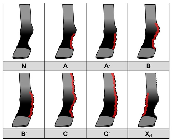 CPL scoring system, based on the presence and distribution of skinfolds and nodules. N: Normal limb, no clinical signs of CPL. A: Mild to moderate skinfolds and/or nodules in the pastern region, below the fetlock, in which the outline of the pastern maintains a concave shape. A-: Thick skinfolds and/or nodules in the pastern region, below the fetlock, in which the pastern cavity is completely filled with skinfolds and/or nodules. B: Mild to moderate skinfolds and/or nodules in the pastern region, including the fetlock, in which the outline of the pastern maintains a concave shape. B-: Thick skinfolds and/or nodules in the pastern region, including the fetlock, in which the pastern cavity is completely filled with skinfolds and/or nodules. C: Mild to moderate skinfolds and/or nodules in the pastern, fetlock, and metacarpal/metatarsal region, in which the outline of the pastern maintains a concave shape. C-: Thick skinfolds and/or nodules in the pastern, fetlock, and metacarpal/metatarsal region, in which the pastern cavity is completely filled with skinfolds and/or nodules. Xd: Presence of skinfolds and/or nodules on the dorsal side of the limb. This can be present in any of the previously mentioned scores, resulting in Ad(-), Bd(-), or Cd(-).