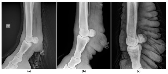 In general, radiographic imaging is considered the most important medical imaging modality for the routine diagnosis of CPL. This technique enables the early detection of skin alterations and provides an important added value in visualizing skinfolds and nodules when palpation is hampered by the presence of abundant feathering on the limbs (Figure 15) [8]. Indirect lymphangiography is a non-invasive technique in which a contrast medium is injected intradermally, followed by radiography to examine the morphology of lymphatic vessels. De Cock et al. have successfully used this technique in draft horses with severe CPL to visualize the tortuous and dilated lymphatic vessels in the distal limbs [6]. In addition, De Cock et al. have demonstrated the presence and severity of lymphatic stasis in CPL-affected draft horses by using lymphoscintigraphy [7]. While lymphoscintigraphy is the method of choice to distinguish lymphedema from other causes of distal-limb swelling in humans, this technique is not routinely used in draft horses.