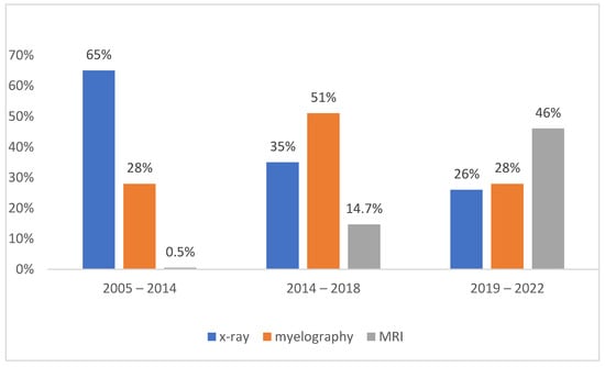We divided the study into three time periods. The first period was characterized by low use of MRI, whereas the main diagnostic procedures consisted of radiographs and myelography (2005–2014). In the second period, both radiographs and myelographs were performed, with myelography predominating; however, few patients also underwent MRI (2015–2018). In the third period, most dogs underwent MRI, although radiographs continued to be performed with myelography (2019–2022). These periods were chosen because the number of dogs examined with MRI gradually increased and the dog population changed in recent years in terms of breed distribution.