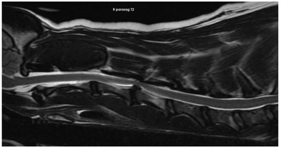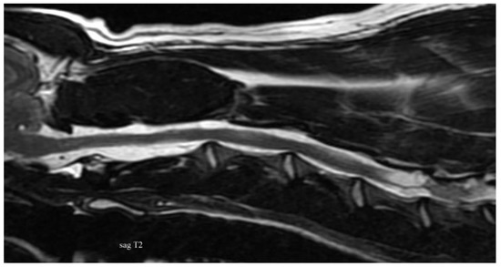 In addition to signalment and anamnesis, the diagnostics of neurologic diseases affecting the spine and spinal cord is mostly based on the findings of neurologic examinations and imaging methods. Radiographic evaluation is based on lateral and ventrodorsal orthogonal projections, these are performed after stabilization of the animal in cases of trauma. During the entire examination, it is very important to minimize the manipulation with the spinal column [9]. Therefore modern veterinary neurology and neurosurgery cannot exist without diagnostically very reliable and sophisticated techniques that include computed tomography (CT) and magnetic resonance [10]. Magnetic resonance imaging (MRI) is increasingly used in the diagnostics of small animal spinal cord trauma to identify the site of compression and parenchymal changes [11,12,13,14]. Compared to a CT scan or X-ray imaging, MRI provides more details about the severity, exact localisation, and nature of spinal cord compression. The incidence of canine acute myelopathies has been well documented using MRI [12,15,16,17,18,19]. Progress and an increased availability of the new sophisticated imaging diagnostic methods have created better conditions for veterinary practitioners in terms of diagnostics and therapy of many neurological cases [19].
