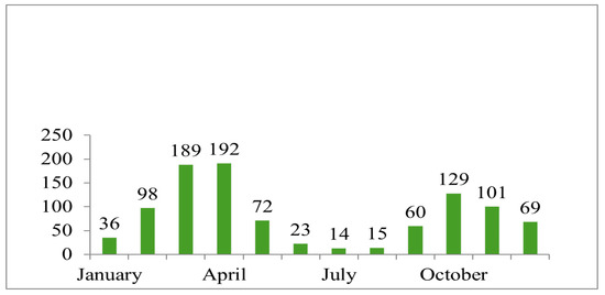 In the present study, we analysed the number of affected dogs in each month of the year. The months with the highest incidence were February, March, April, May, October, November, and December. The number of dogs in each month varied greatly, as can be seen in Figure 9.