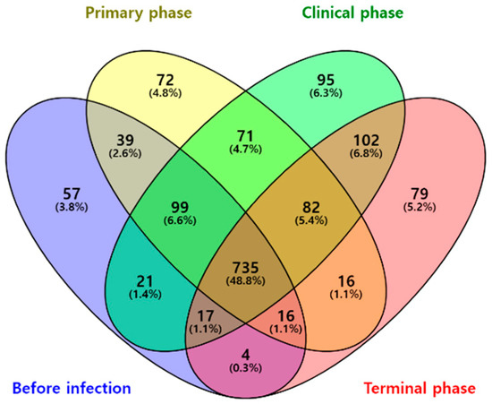 A total of 735 OTUs were matched in all groups, and 57, 72, 95, and 79 OTUs were uniquely identified in the before infection, primary phase, clinical phase, and terminal phase, respectively, as shown in Figure 1. The richness estimates (ACE, Chao1) were highest before infection with the ASFV and significantly decreased over the following phases (Figure 2a). On the other hand, the diversity estimates, such as NP Shannon and Shannon, significantly increased in the clinical phase, while the Simpson index significantly decreased (Figure 2b; Table 2).
