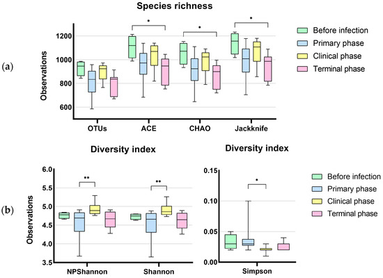Dynamic changes in gut microbial alpha diversity of ASFV-infected pigs determined by (a) observed operative taxonomic units (OTUs), ACE, Chao1, and Jackknife index, (b) NP Shannon, Shannon, and Simpson. Statistical significance was revealed with the decrease in species richness and diversity during ASFV infection (* p < 0.05, ** p < 0.01). On the other hand, the diversity indices significantly increased at the terminal phase of ASF.
