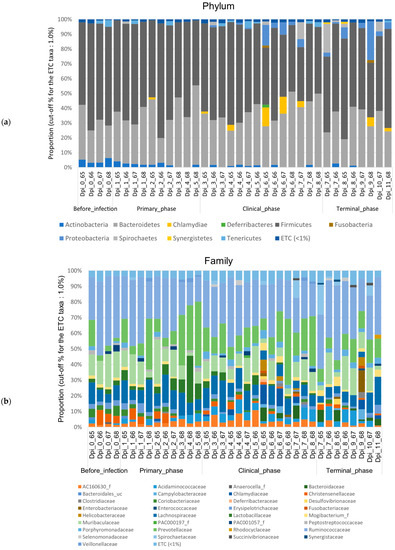 We obtained an average of 51,463 high-quality reads (average read length of 281 bp) from the four phases, namely, before infection, primary phase, clinical phase, and terminal phase. These reads resulted in 983 ± 70, 850 ± 121, 939 ± 76, and 818 ± 93 bacterial OTUs, respectively.