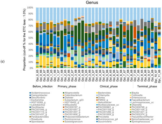 At the genus level, although Sodaliphilus was the predominant taxon before infection, Prevotella was predominantly found in the primary and clinical phases, and Eubacterium_g23 was predominant in the terminal phase. Throughout all phases, the relative abundances of Spirochaetaceae_uc, AF371579_g (Lachnospiraceae), Bacteroides, and FMWZ_g were significantly decreased, while those of PAC000683_g (Ruminococcaceae), EU463156_g (Bacteroidales), Libanicoccus, and Lactobacillaceae_uc tended to decrease significantly (p < 0.05) (Figure 5c and Figure A2).