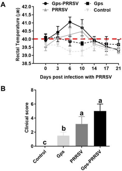 Clinical observations in piglets. (A) Rectal temperature (mean ± SD) and (B) clinical score (mean ± SD) of piglets inoculated with Gps and HP-PRRSV2 (Gps-PRRSV), Gps alone (Gps), HP-PRRSV2 alone (PRRSV), and placebo (control). The coinfected piglets were challenged with HP-PRRSV2 at 5 days post-Gps infection. After HP-PRRSV2 infection, piglets in the Gps+ HP-PRRSV2 and HP-PRRSV2 alone groups displayed significantly higher mean temperatures than those in other groups. Significant differences between the groups are marked by different superscript letters (p < 0.05). The red dotted line in Figure 1A is the threshold of mean rectal temperature for piglets, indicating that the temperature above the red line belongs to the range of fever, while below the red line belongs to the range of normal.