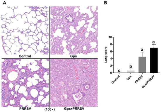 Pathological examination of the lung from all piglet groups at 6 dpi. (A) Histopathological changes and (B) the lung score (mean ± SD) of piglets inoculated with Gps and HP-PRRSV2 (Gps +PRRSV), Gps alone (Gps), HP-PRRSV2 alone (PRRSV), and placebo (control). All lung tissues were collected from each group of randomly euthanized piglets at 6 days post-HP-PRRSV2. The coinfected piglets were challenged with HP-PRRSV2 at 5 days post-Gps infection. Significant differences between the groups are marked by different superscript letters (p < 0.05).