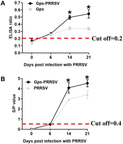 Antibody responses against Gps and HP-PRRSV2 infections. (A,B) Scheme 0 to 21 dpi and anti-Gps/HP-PRRSV2 antibodies were determined by ELISA. The horizontal line represents cut-off values for assays. Data are presented as the mean ± SD. * Compared with single-infected groups (Gps or HP-PRRSV2 alone) within the same day (p < 0.05, Student’s t-test).